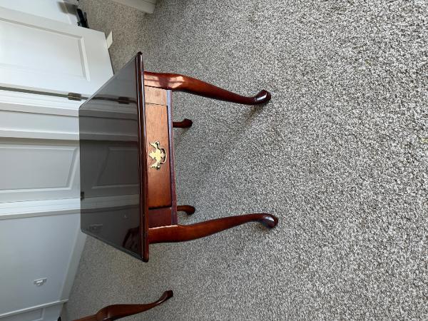 Beautiful solid wood side tables. Has a rich, dark finish. Each table has a drawer with a decorative brass pull. This set includes one square, one rectangular, and one round table. All have classic cabriole legs. Selling each for $50